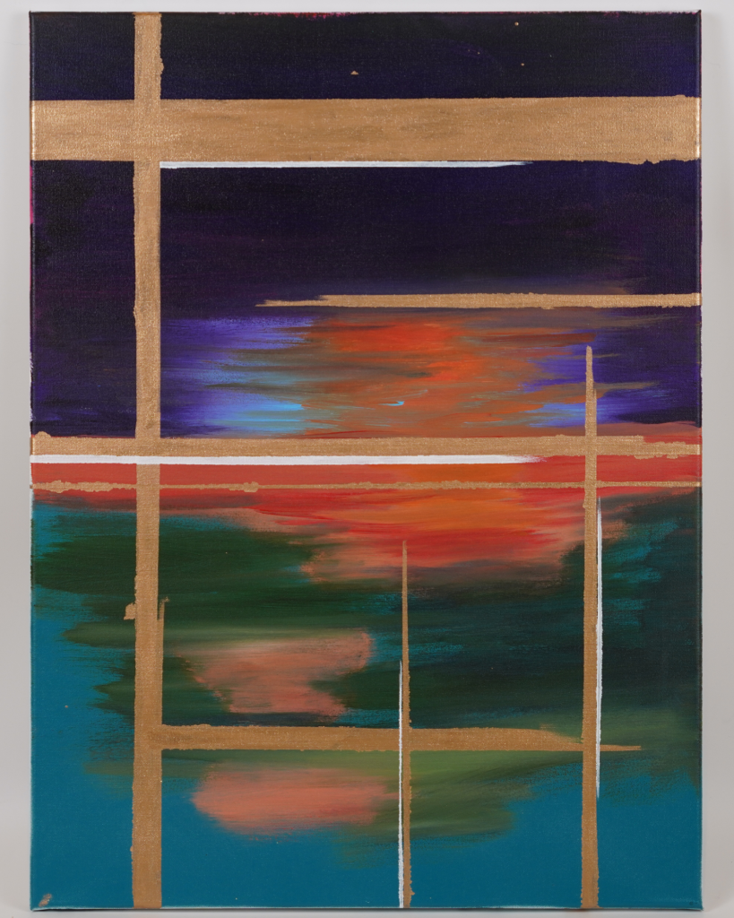 The final touch that elevates “Belize” is the addition of accent gold lines. These lines are not merely decorative but are integral to the painting’s dynamic. They shimmer against the cooler background, reminiscent of the last rays of sunlight dancing on the ocean’s surface. The gold lines bring a layer of warmth and luminosity to the artwork, creating a striking contrast with the inverse color palette.