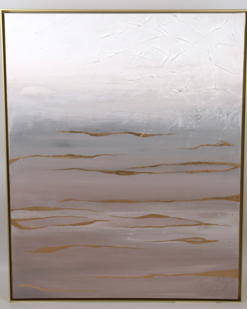 What truly sets “Daydreams” apart is the use of liquid gold leaf. Waving through the canvas, the gold leaf creates a dynamic flow that weaves the colors together. Its luminous quality adds a sense of movement and fluidity, like sunbeams dancing through a soft morning haze. The gold leaf not only brings a luxurious sheen to the piece but also adds a dimension of warmth and richness, contrasting beautifully with the cooler elements of the palette.