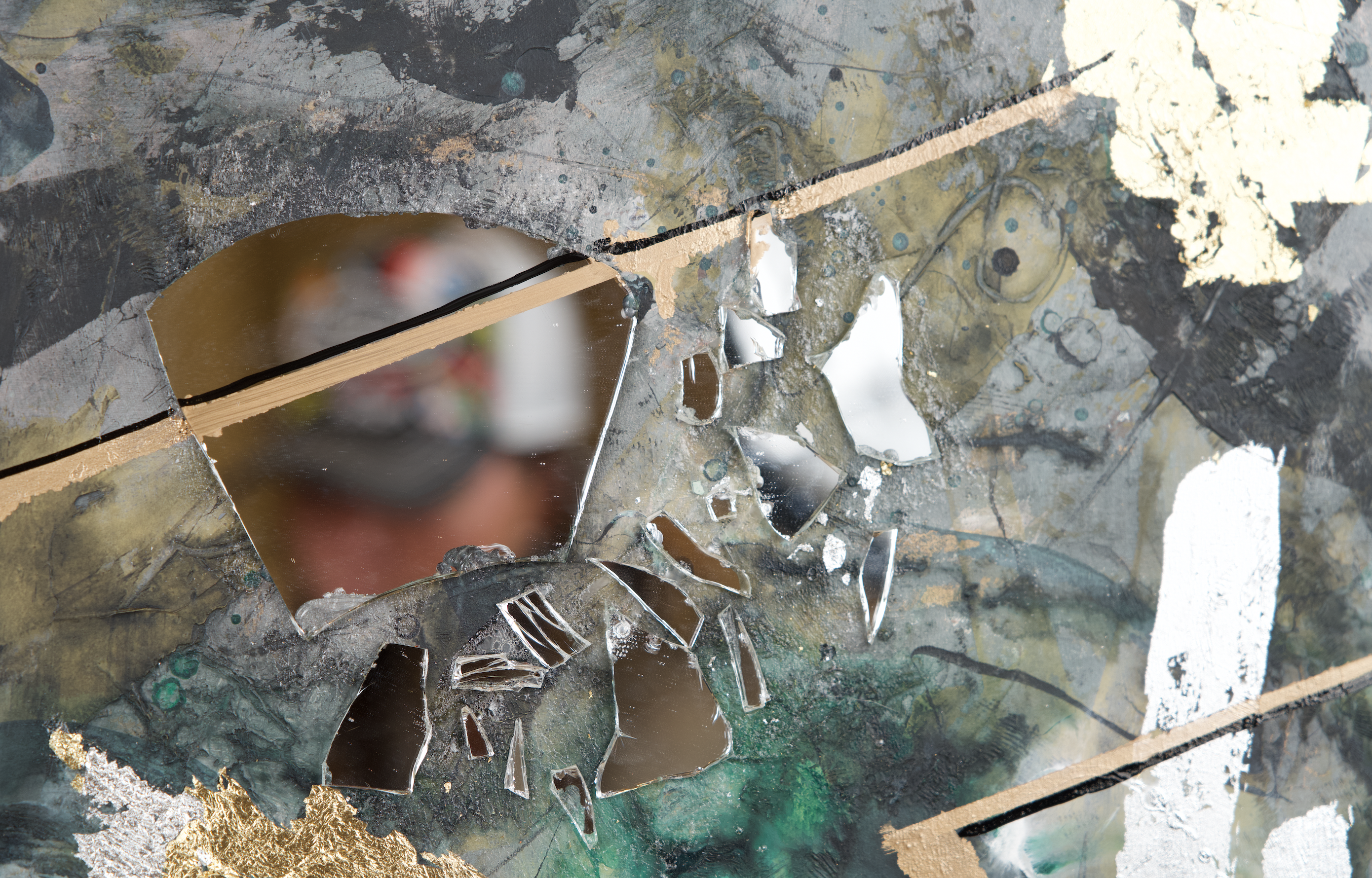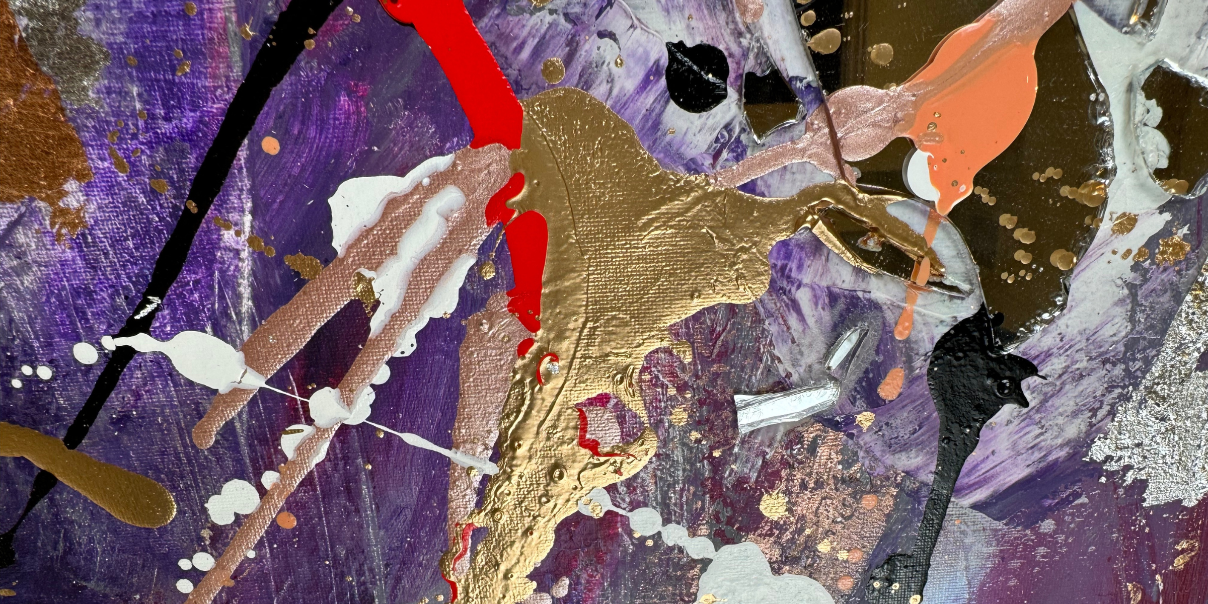 White circular brushstrokes float across this complex landscape, like thought bubbles or drifting clouds in a stormy sky. These brushstrokes add a layer of softness and dreaminess to the piece, providing a visual pause in the midst of the more intense colors.The artwork is completed with drips of gold and pops of black. The gold drips bring a touch of luxury and elegance, adding a sense of value and preciousness to the abstract thoughts and emotions depicted. The black pops, on the other hand, ground the piece, pulling the disparate elements together and providing a sense of completion and cohesion.