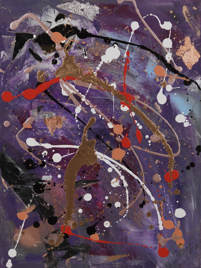 A striking feature of “Simmer Down” is the gold leaf that pushes through from the side. This element adds a sense of luxury and intensity, representing the mounting pressure or heat within the simmering concoction of colors. The gold leaf catches the light, drawing the eye and adding a dynamic quality to the artwork. The piece is further animated by bubbling white and contrasting black strokes. These strokes add movement and texture, enhancing the feeling of bubbling and simmering. The contrast between the white and black strokes creates a visual tension, mirroring the push and pull of internal emotions and thoughts as they rise to the surface.