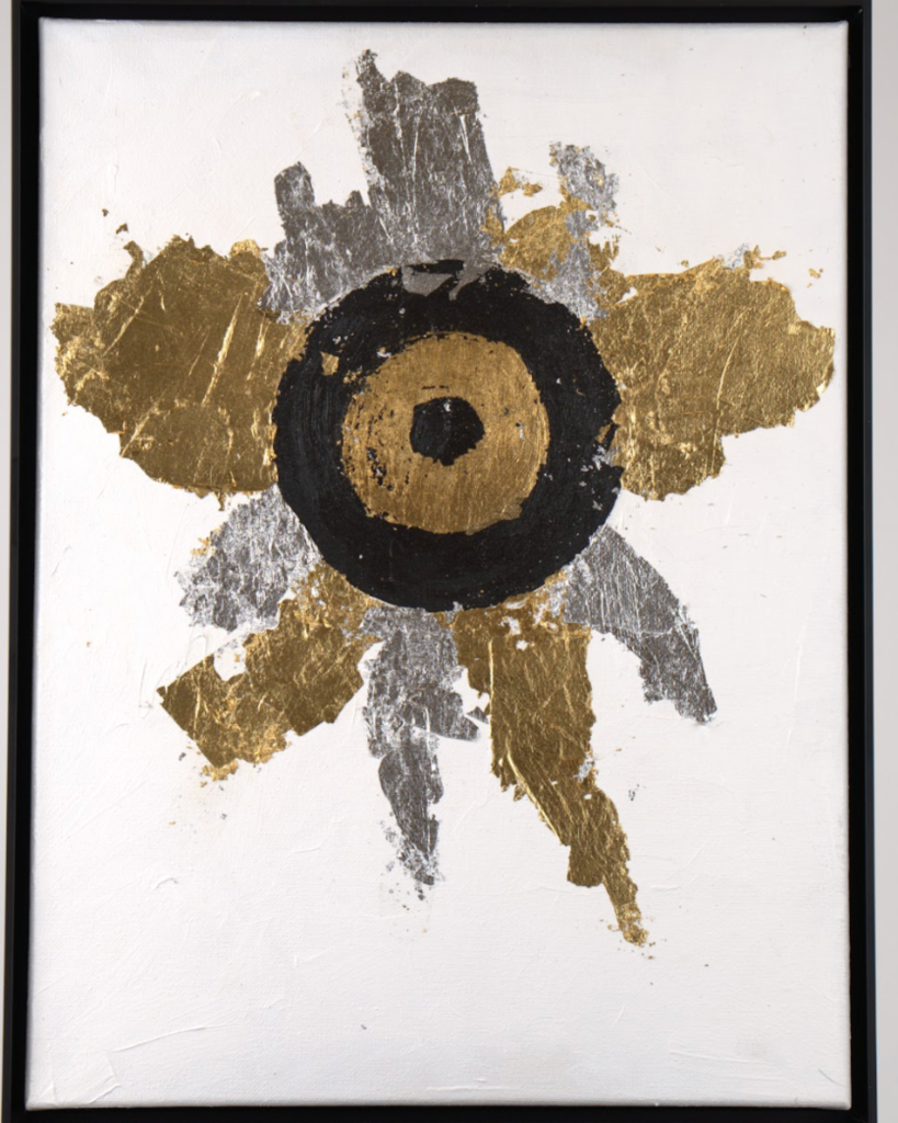 Radiating out from this central eye is the painting’s most captivating feature: flames of gold and silver leaf. These metallic elements are applied with a masterful touch, their shimmering surfaces catching the light and bringing the painting to life. The gold leaf, warm and vibrant, represents the fiery intensity and the fierce spirit of the tiger. In contrast, the silver leaf adds a touch of elegance and fluidity, reminiscent of the sleek and graceful movements of this majestic animal.