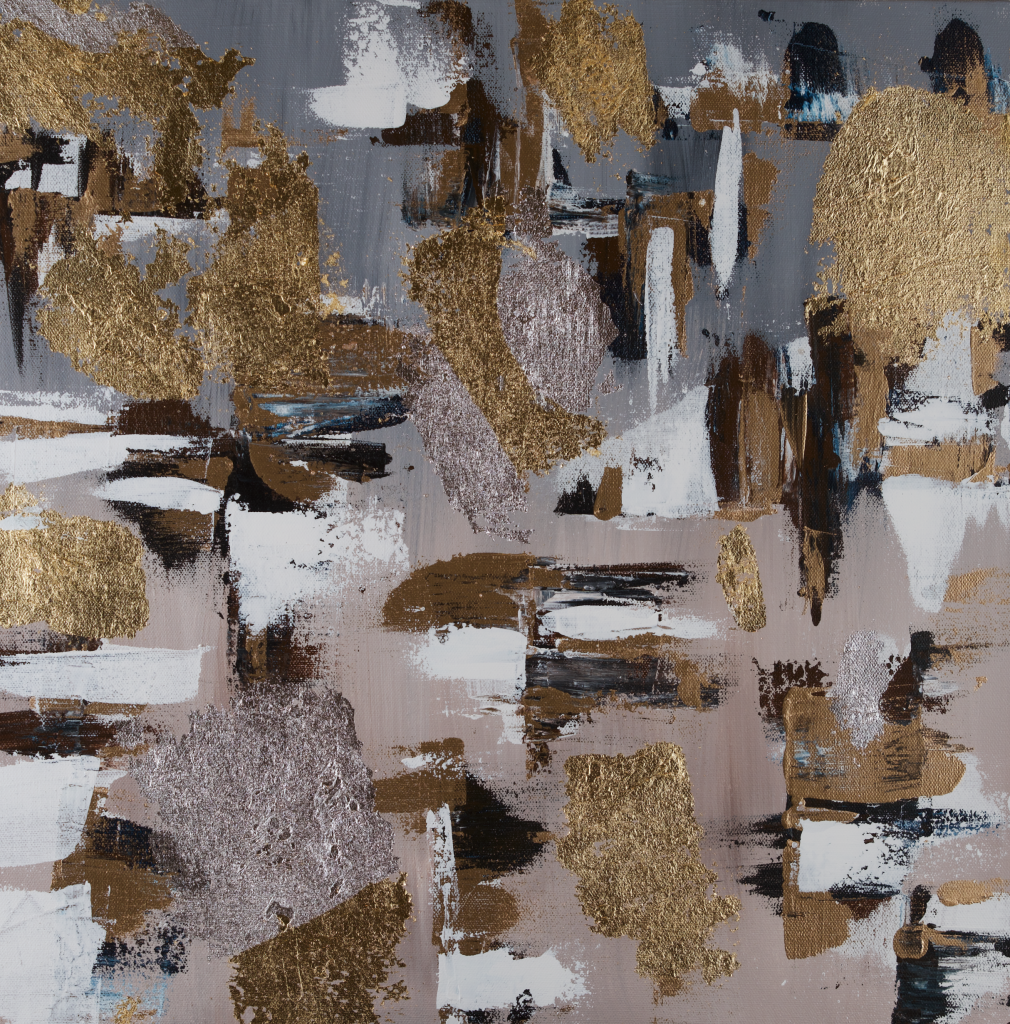 As a contrast to its predecessor, “Summer”, “Winter,” an abstract acrylic painting, masterfully encapsulating the serene and introspective essence of the colder weather. This artwork skillfully blends a palette of dark browns and greys with the luxurious embellishments of gold and silver leaf, interspersed with splashes of white.